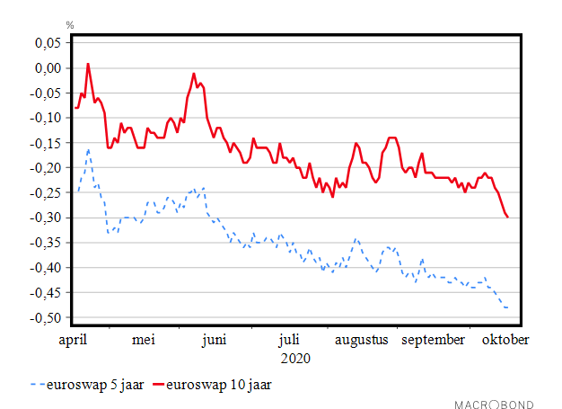 Markten reageerden op de beperkende maatregelen die een aantal Europese regeringen aankondigden. De maatregelen moeten de toename van het aantal coronabesmettingen een halt toe roepen. De nederlandse regering besloot afgelopen dinsdag tot het sluiten van de horeca, het beperken van het aantal contacten binnen en buiten en het tegengaan van reisbewegingen. De maatregelen gelden in beginsel voor twee weken. Ook in België, Frankrijk, Duitsland en Italië werden maatregelen aangekondigd. De maatregelen zullen een negatief effect hebben op de bedrijvigheid in het vierde kwartaal. Ook neemt de druk op de ECB toe om nieuwe monetaire maatregelen te nemen. De tienjaars euroswaprate daalde daardoor met 8 basispunten naar -0,30 procent.