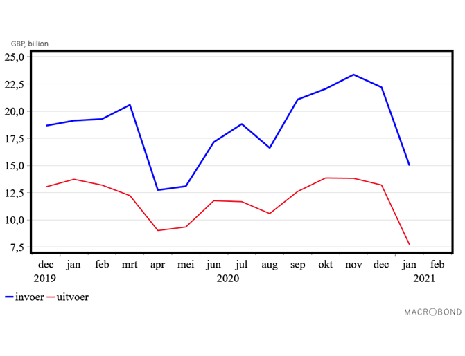 De Britse goederenhandel met de landen van de EU is in januari zoals verwacht fors teruggelopen. De uitvoer naar de Europese Unie (EU) daalde met bijna 42 procent naar 7,7 miljard pond, terwijl de invoer met 32,5 procent terugliep naar 15,0 miljard pond. De uitvoer van goederen naar Nederland daalde eveneens sterk, namelijk met ruim 33 procent naar 1,3 miljard pond. De invoer van goederen uit ons land nam met bijna 32 procent af naar 2,3 miljard pond. De forse daling van de handel tussen Groot-Brittannië en de EU-landen wordt veroorzaakt door de brexit. Veel bedrijven waren niet voorbereid op de extra administratieve verplichtingen aan de grens als gevolg van de brexit. De verwachting is wel dat deze overgangsproblemen zullen verdwijnen waardoor de handel zich weer zal herstellen.