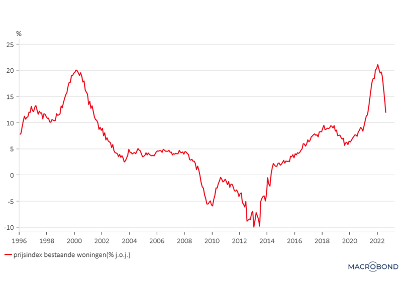 De huizenprijs lag in augustus in ons land 11,9 procent hoger dan een jaar geleden. Dat is aanmerkelijk minder dan in voorgaande maanden. In januari van dit jaar bedroeg de prijsstijging nog 21 procent. Ook het aantal transacties nam vorige maand af. In augustus werden 16.405 woningen verkocht, 5 procent minder dan in dezelfde maand van 2021. In de eerste acht maanden van het jaar werden zelfs 20 procent minder woningen verkocht. De afnemende activiteit op de woningmarkt valt deels te verklaren door de sterke stijging van de hypotheekrentes. Nog belangrijker is waarschijnlijk dat consumenten steeds minder vertrouwen hebben in de toekomst. De indicator van het consumentenvertrouwen daalde in augustus naar -59, het laagste niveau sinds het CBS in 1986 met dit onderzoek begon. Consumenten zijn vooral pessimistisch over het economisch klimaat en geven aan dat het momenteel een ongunstige tijd is om grote aankopen te doen.