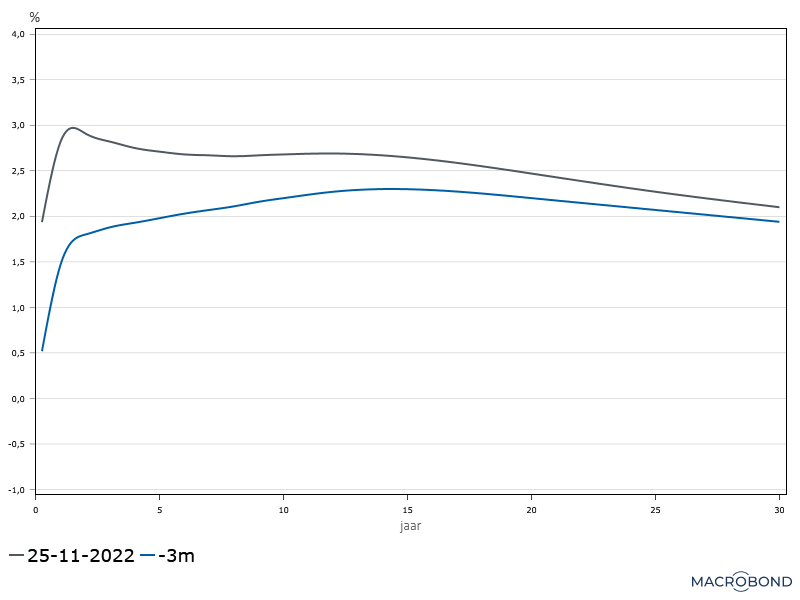 Beleggers blijven ervan uitgaan dat de centrale banken de rentetarieven in de nabije toekomst verder zullen verhogen, maar minder sterk dan in de afgelopen maanden. De lange rentetarieven namen daardoor licht af en blijven daardoor rekening houdend met de inflatie op lage niveaus.Standen per 25 november 2022