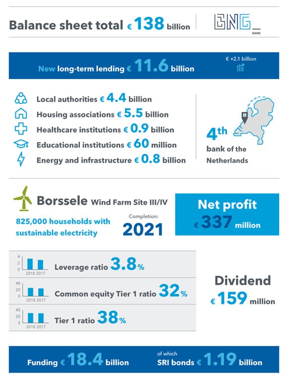 BNG Bank provided €11.2 billion in long-term loans in 2018, with a strong focus on sustainability. The bank actively supported the energy transition through financing and knowledge sharing. Net profit amounted to €337 million, partly thanks to one-off tax benefits. View the 2018 annual report and all accompanying documents here.