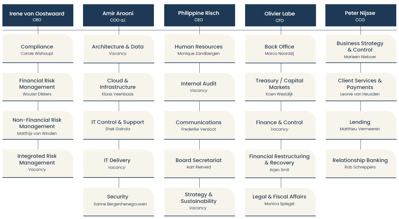 In het organogram is weergegeven welke afdelingshoofden rechtstreeks rapporteren aan de leden van het Executive Committee.