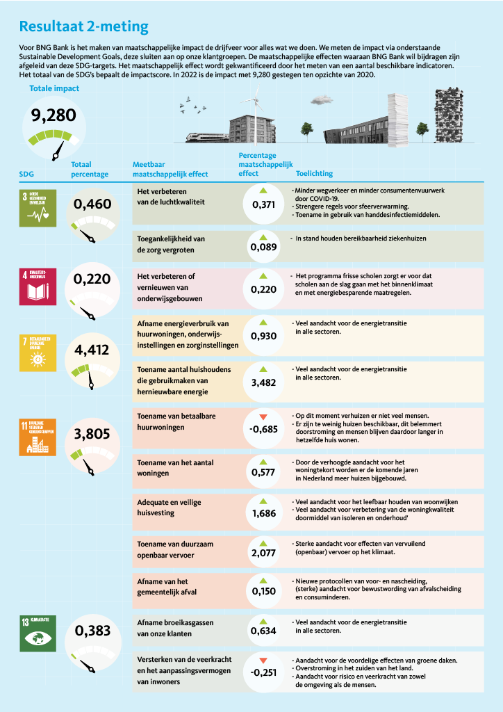 Deze meting vindt plaats aan de hand van een set kwantificeerbare indicatoren gelinkt aan vijf Sustainable Development Goals (SDG’s) die aansluiten op onze klantportefeuille. De rapportage vindt jaarlijks plaats op onze website.